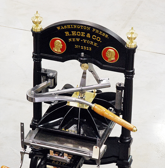 This machine bears the medallions of Benjamin Franklin and George Washington in bas-relief on the head as well as brass finials on head and the platen. The figure 4 toggle is a key feature of R. Hoe’s Washington style iron presses.