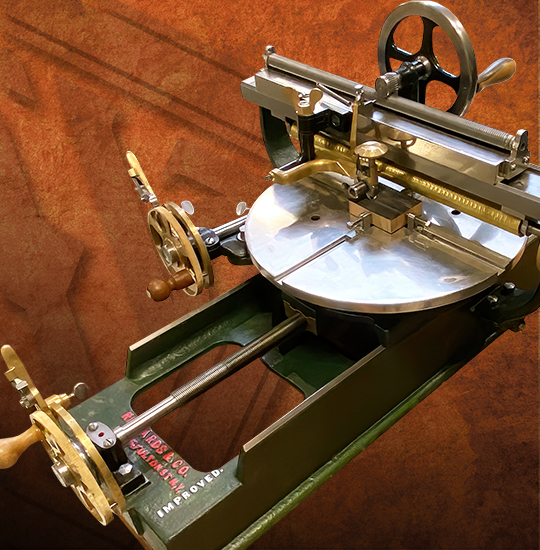 This Richards & Co. Ruling Machine was made for wood engraving. The system produces a field of evenly spaced lines according to the pattern chosen.The block is placed on the bed which moves front to back, and the engraving tool glides over the block creating a cut line, lift the tool, move the bed one increment, then repeat the whole process as many times as needed. The bed can be set at an increment as minute as 1/260th of an inch, and the depth of cut is also adjustable. After Richards’ death, John Royle & Sons, Paterson, NJ, acquired the patents, and started making them under Royle-Richards Ruling Machine in the early 1890s.