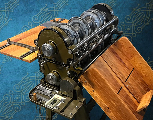 Besides the guillotine, an early Liberty paper folder and Berry paper drill are on display. These machines didn’t receive the same technology developments of the printing press. Although bindery work is still crucial, the earliest days of bindery tested both men and women to their limits.
